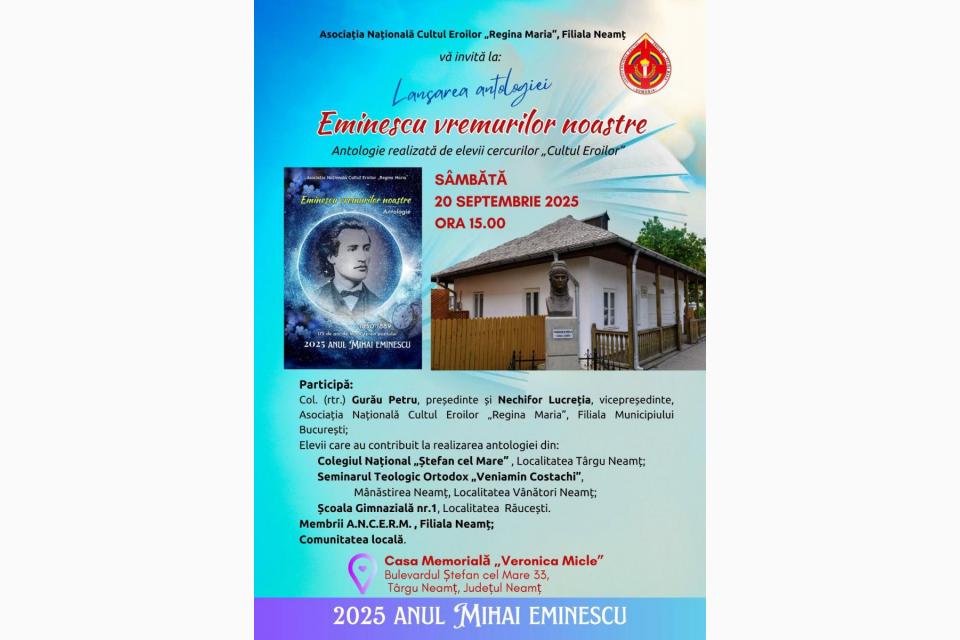 În această zi, începând cu ora 15.00, la Casa Memorială „Veronica Micle”, situată în Bulevardul Ștefan cel Mare nr. 33, Târgu Neamț, are loc lansarea antologiei „Eminescu vremurilor noastre”, realizată de elevii cercurilor „Cultul Eroilor”, sub egida Asociației Naționale Cultul Eroilor „Regina Maria”, Filiala Neamț. Participă col. (rtr.) Petru Gurău, președinte, și Nechifor Lucreția, vicepreședinte al Asociației Naționale Cultul Eroilor „Regina Maria”, Filiala Municipiului București, precum și elevi de la Colegiul Național „Ștefan cel Mare” Târgu Neamț, Seminarul Teologic Ortodox „Veniamin Costachi” și Școala Gimnazială nr. 1 Răucești care au contribuit la realizarea antologiei. De asemenea, vor fi prezenți membrii Asociației Naționale Cultul Eroilor „Regina Maria”, Filiala Neamț, alături de comunitatea locală. Evenimentul se înscrie în seria manifestărilor dedicate Anului Mihai Eminescu – 2025.