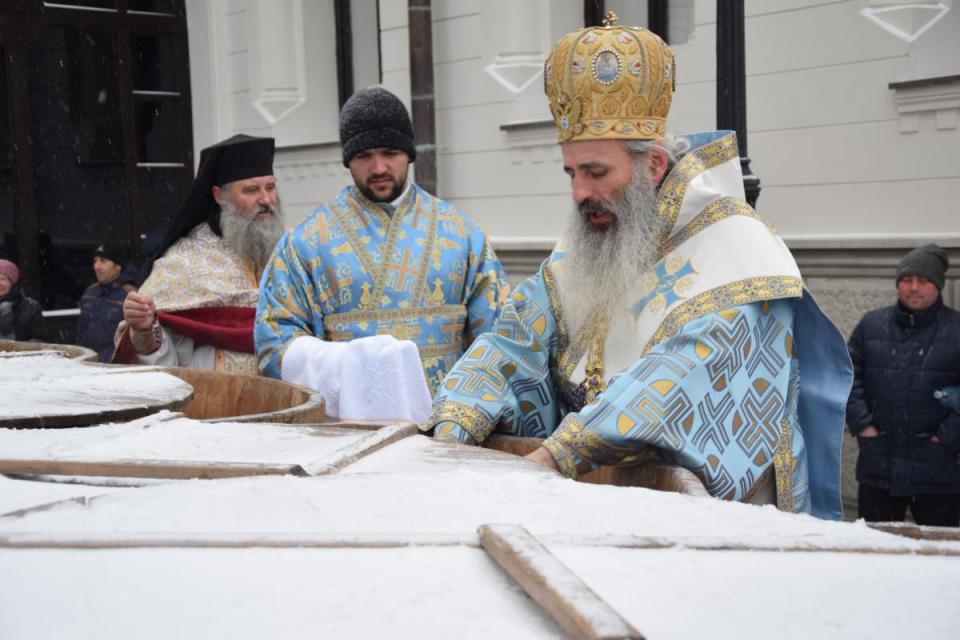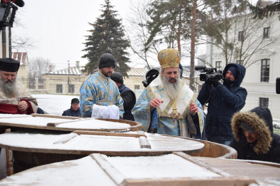 După citirea rugăciunii amvonului, întreg soborul slujitor a ieşit pe amplasamentul din faţa Catedralei Mitropolitane, în glasul clopotelor şi al troparelor specifice praznicului Botezului Domnului şi Mântuitorului nostru Iisus Hristos, unde a fost săvârşită slujba Sfinţirii celei mari a apei. Pentru sărbătoarea din acest an au fost pregătite 12 vase de lemn a câte 1.000 de litri.